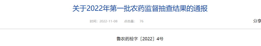 近日,山东省根据《山东省农业农村厅关于开展2022年农药质量监督抽查工作的通知》(鲁农药检字〔2022〕1号),通过专项交叉抽查、例行抽查和重点抽查等方式,在全省组织开展了农药产品质量监督抽查。现将第一批农药监督抽查结果通报如下。