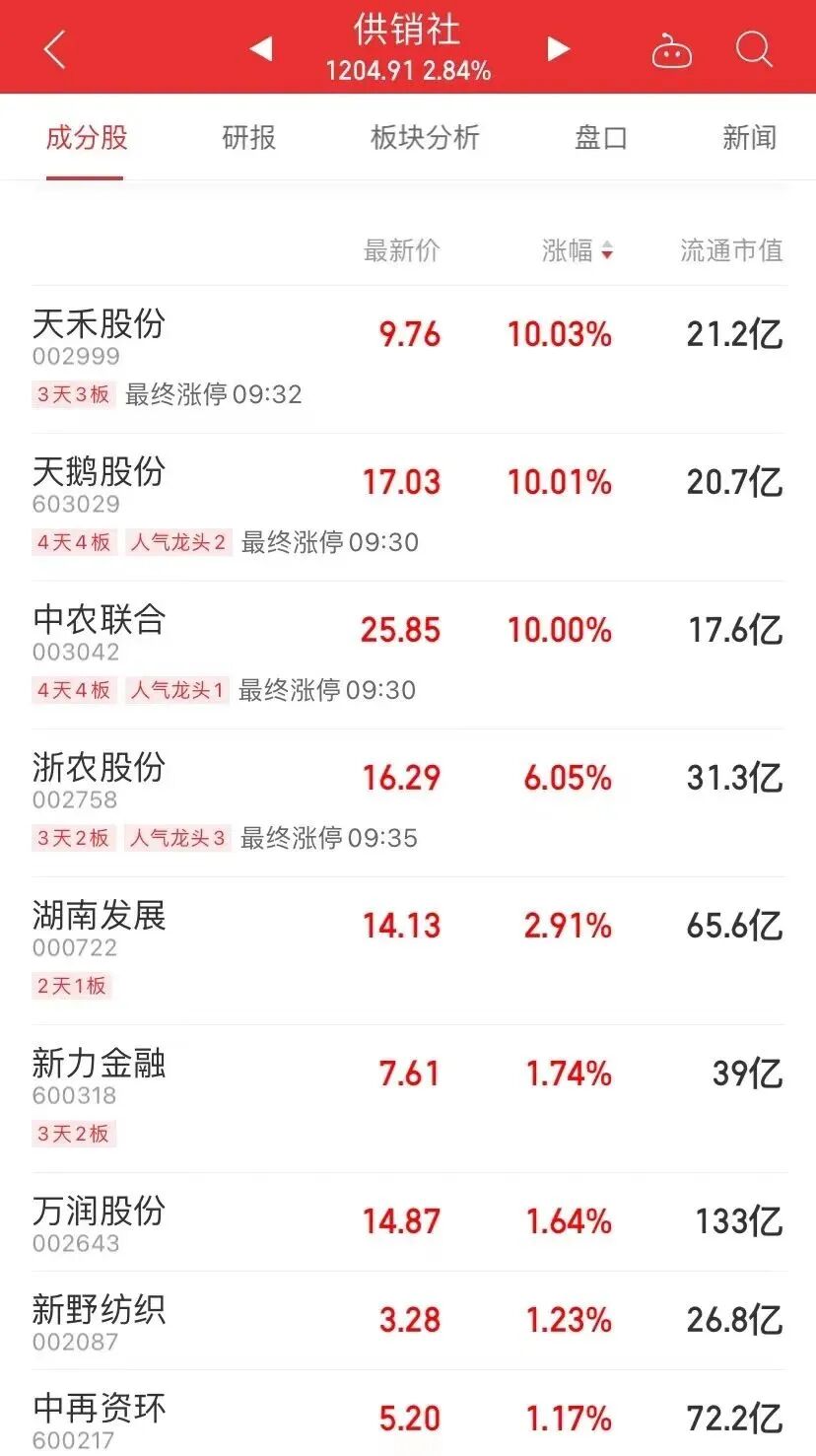 截至今日(11月3日)午间收盘,和供销社有关的天禾股份、中农联合、天鹅股份涨停,其中,中农联合、天鹅股份已连续四个涨停板,天禾股份连续三个涨停板。