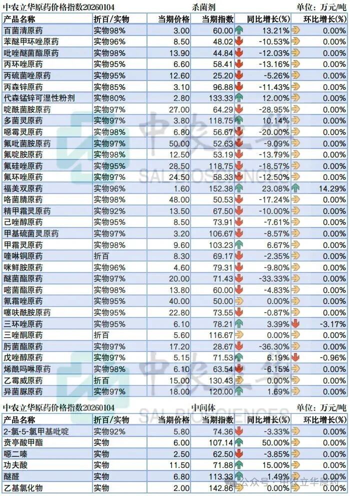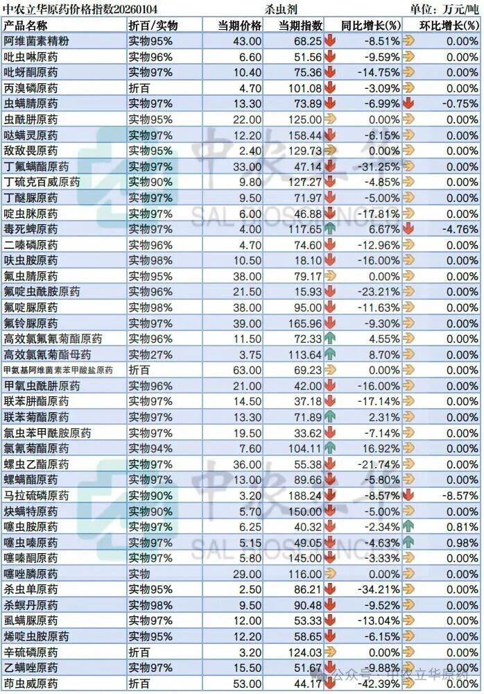 本周元旦假期,原药市场行情稳定为主,阿维菌素、甲维盐、敌草快等询盘活跃度上升。随着农药新政落地,预计市场需求逐步释放,各环节需要密切关注成本、库存、国内外需求端变化等市场重要行情走势影响因素,采取灵活备货策略。