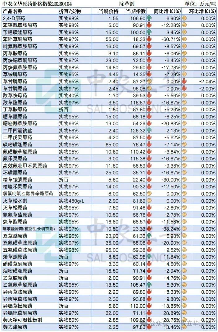 ☆同比去年☆ 上涨:2,4-D原药、苄嘧磺隆原药、二甲四氯钠盐、双草醚原药、烯草酮原药、乙氧氟草醚原药等 持平:草甘膦原药、氯氟吡氧乙酸异辛酯原药、灭草松水剂等 其余跟踪除草剂品种均下跌