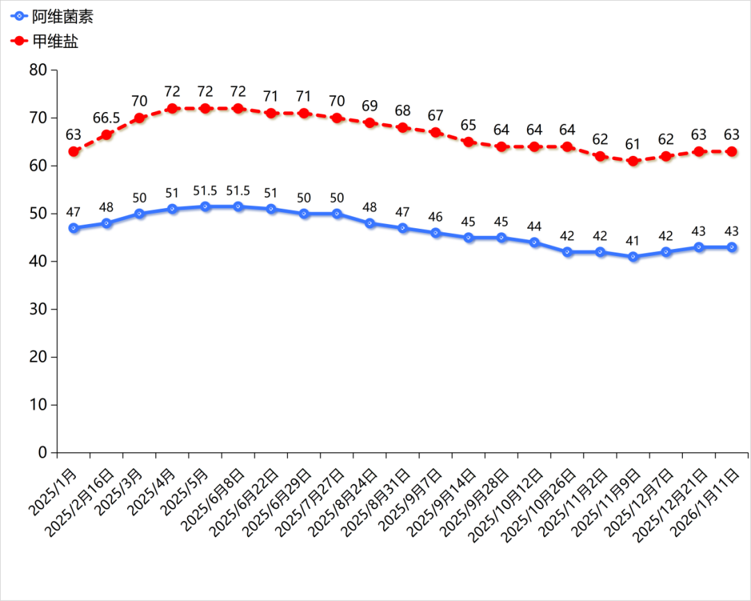中农立华原药数据显示,截至2026年1月11日,阿维菌素精粉流通货源显著减少,厂家提价意愿强烈,报价已达43万元/吨。这一价格水平与2025年同期相比已有明显提升,反映出市场供需关系的实质性变化。